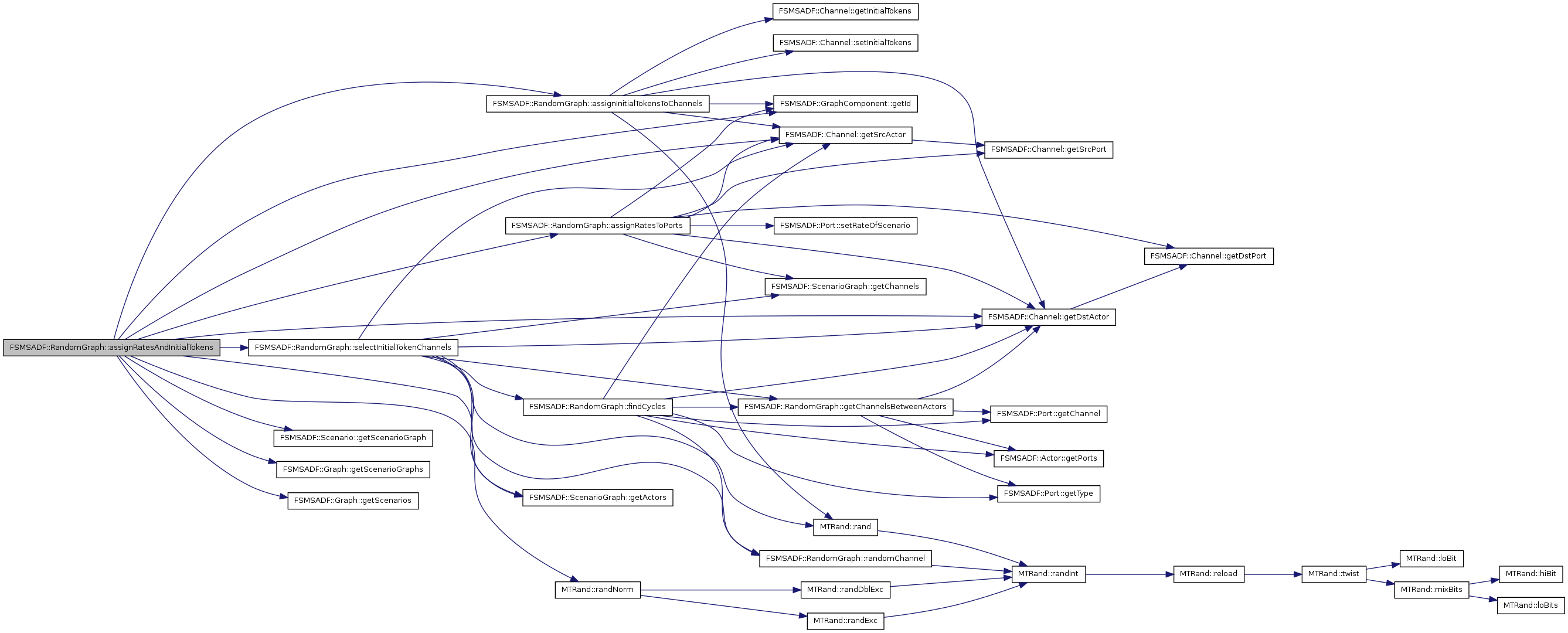 assignRatesAndInitialTokens() The function assigns randomly selected rates to all ports of all scenario graphs. The function also assigns initial tokens to the channels in the scenario graphs. Sufficiently many tokens are added to the graphs to ensure a deadlock-free execution. Furthermore, it holds that the rates on a channel with initial tokens is constant within all scenarios in which this channel appears. When a rate zero is assigned to a channel c in a scenario, then a new scenario graph is created for this scenario. The channel c will be removed from this new scenario graph. Note that the number of scenario graphs may have increased after this function. The number of scenarios does not change.